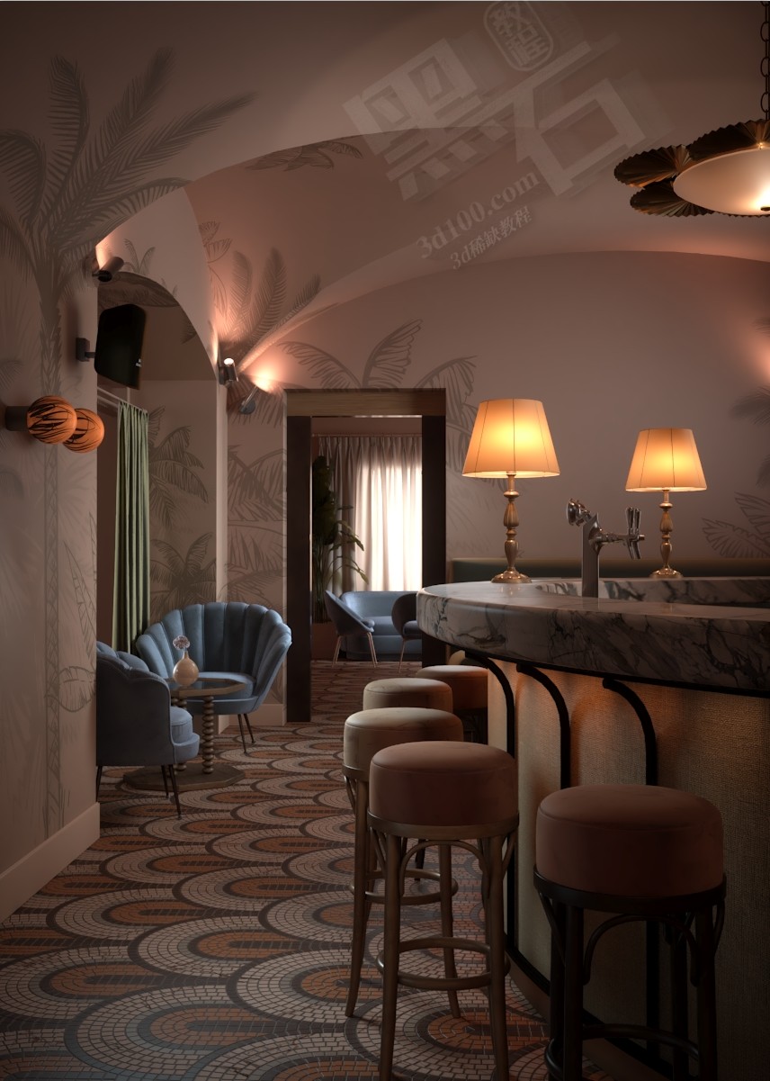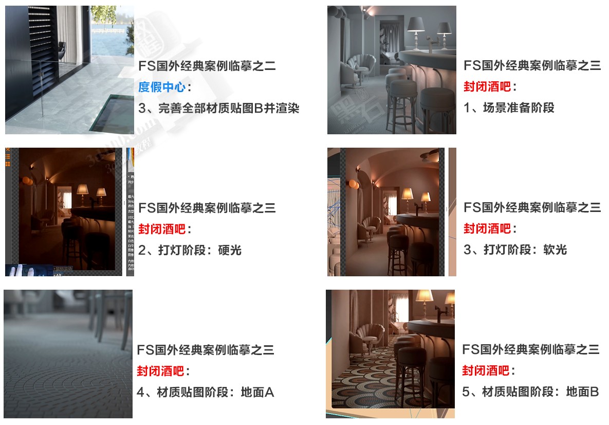 3、课程已完成:吧台封闭空间全程灯光材质渲染,技术点:封闭空间打光技巧、快速展UV、fs多层混合材质技法、fs景深特写设置、ai优化渲染、fs的360全景渲染技法、室内漫游动画1分钟制作技巧