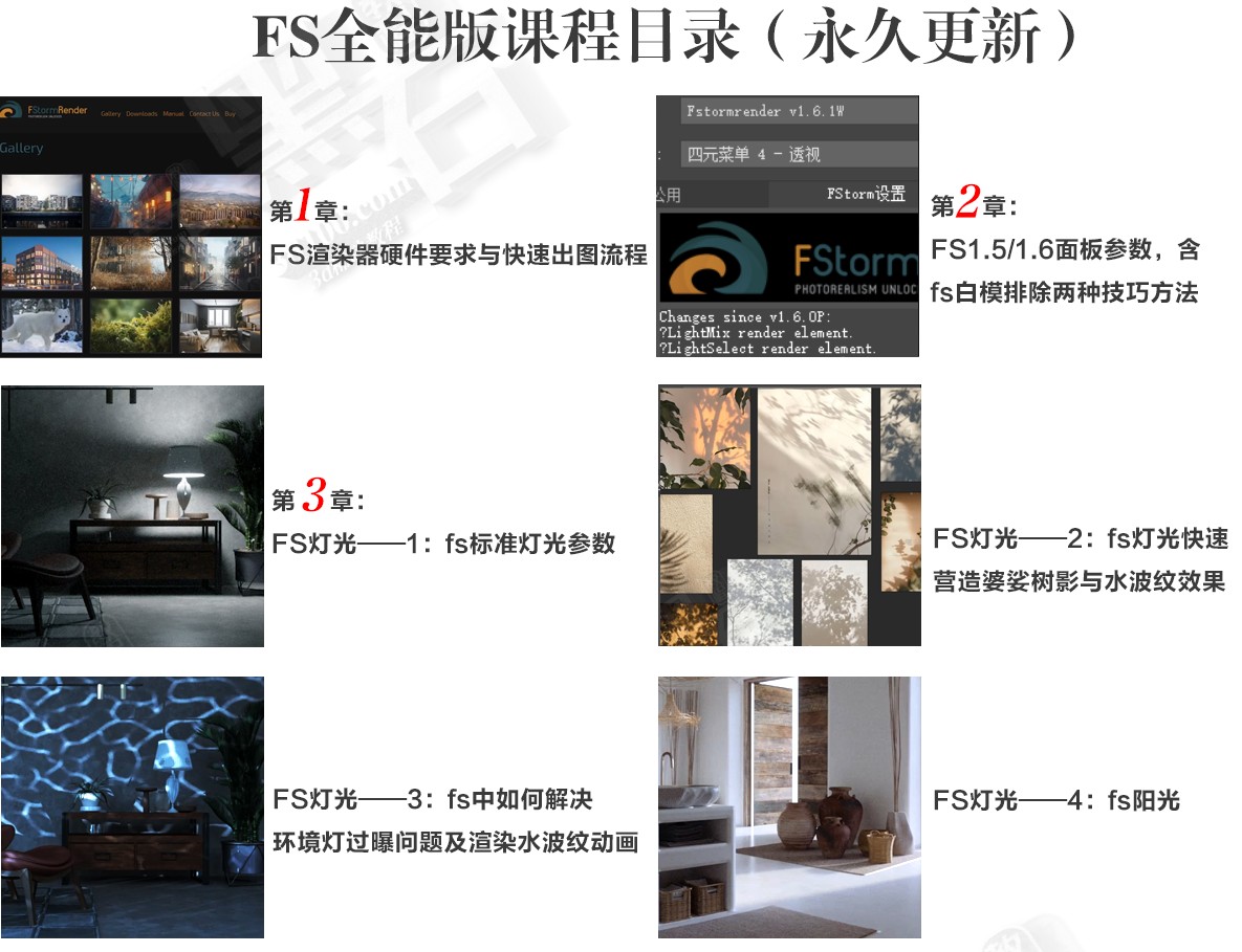 A:课程包含FStorm渲染器快速上手技巧,包括快速打光(天空、阳光、夜景、封闭空间、