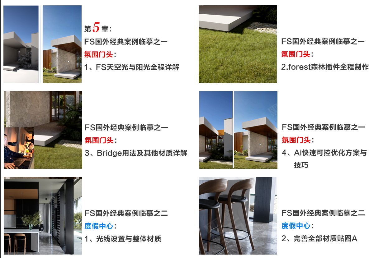 1、课程已完成:氛围门头全程制作(技术痛点:forest森林插件和bridg使用技巧,光线过渡技巧,材质贴图技巧,AI优化照片最佳方案与技巧)